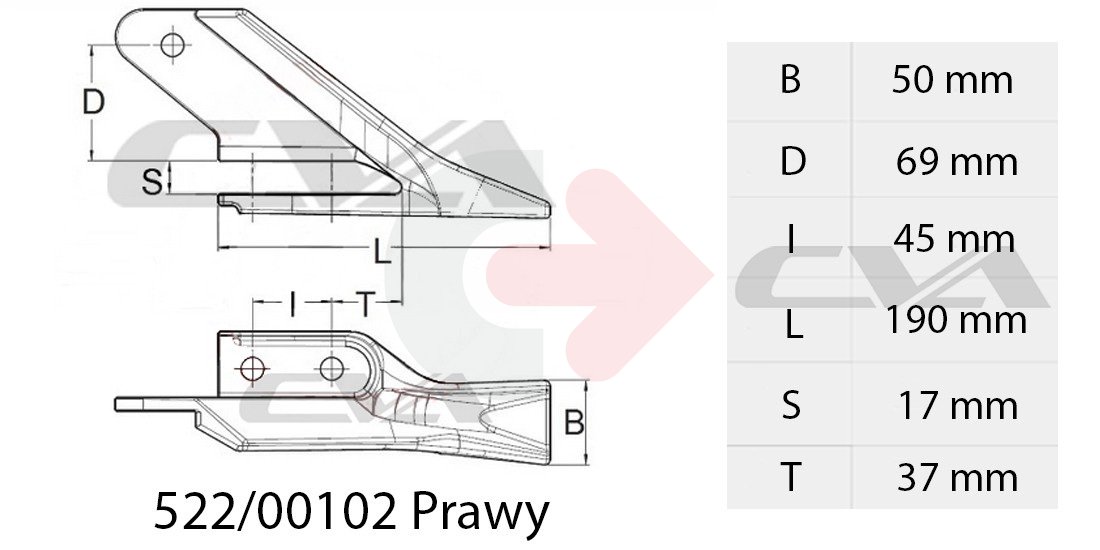 Ząb łyżki koparkowej boczny prawy do stosowania w minikoparkach JCB.